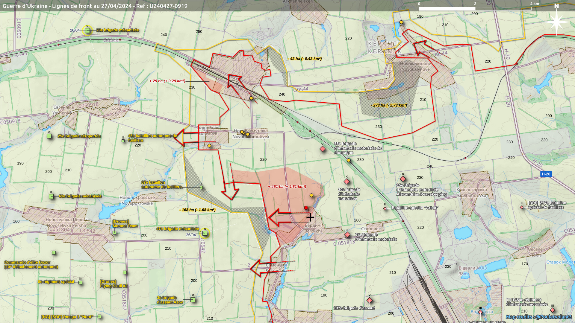 Alors qu’au cours du mois de mars, les Russes ne progressaient que d’une quinzaine de km² chaque semaine, ils ont intensifié leur poussée au cours de ce mois d’avril : 29,8 km² en semaine 15, 23,6 km² en semaine 16 et 26,7 km² cette semaine, soit 80 km² en trois semaines. Nous étions habitués à 2 km² de progression quotidienne, le rythme est passé à près de 4 km² par jour.