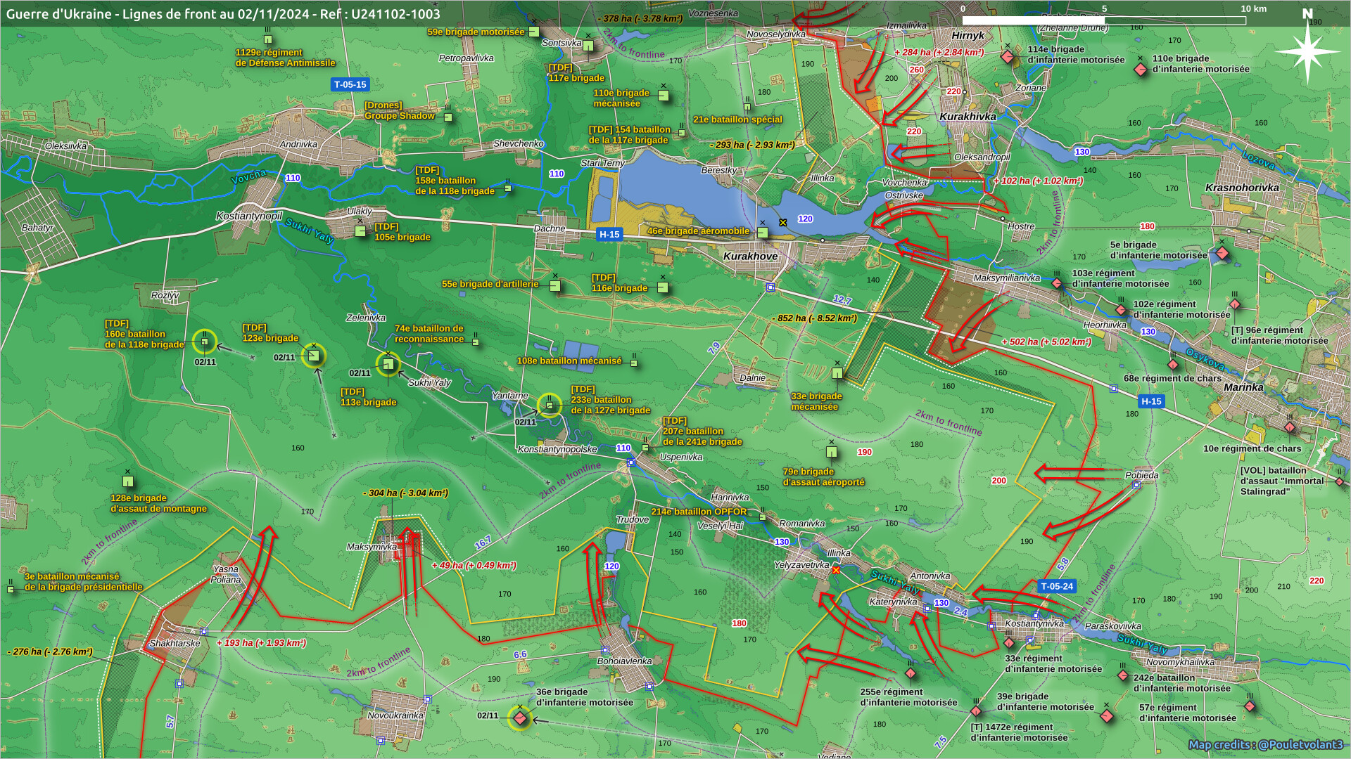 Constatons une stabilité dans la poche de Soudja. Après ajustement, l’Ukraine aurait récupéré 33 km², la Russie 5 km² cette semaine (https://x.com/Pouletvolant3/status/1853027563003584982/photo/2).
