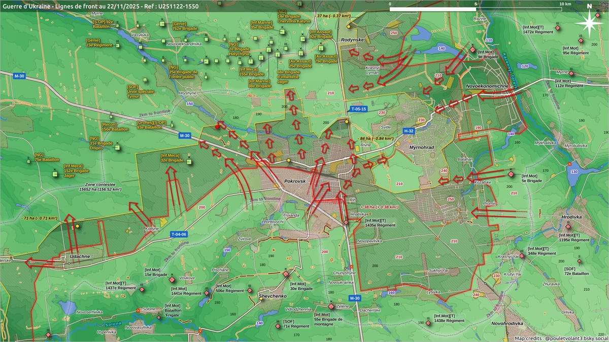 Front de Donetsk : A Pokrovsk , plus aucune troupe ukrainienne dans la ville ni dans Rodynske. Les dernières troupes sont encerclées à Myrnohrad (carte).