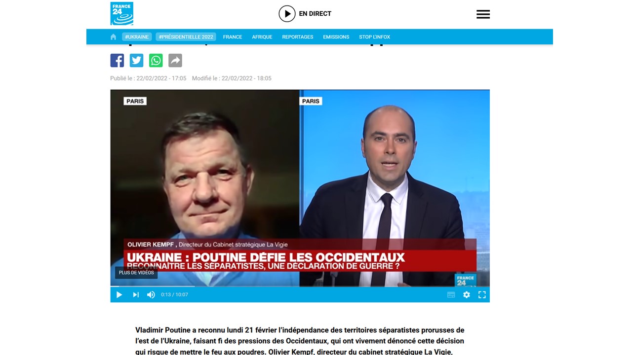 Olivier Kempf a répondu aux questions de France 24, mardi 22 février. Vous pouvez le visionner en cliquant sur ce lien.