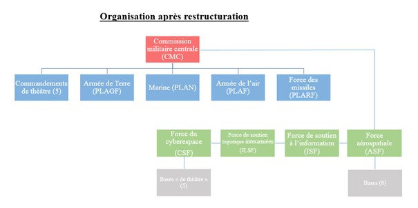 - quatre services (« arms») : la Force aérospatiale (ASF, anciennement l’Aerospace Department of the Strategic Support Force), la Force du cyberespace (CSF), la Force de soutien à l'information (ISF) et la Force de soutien logistique interarmées (JLSF). Ces quatre services seraient des organisations de niveau « Deputy Theater Command Leader », juste un niveau en dessous des quatre armées et des cinq commandements de théâtre.